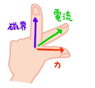 右の手の図を見てください。磁界の向きが人差し指、電流の向きが中指です。このように磁界と電流が直角に交わっていると、親指の方向に力が発生するのです。