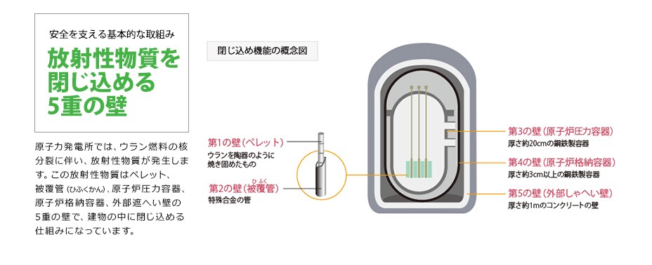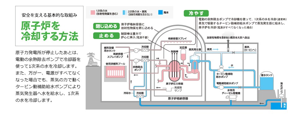 原子力発電所では、核分裂反応を「止める」、燃料を「冷やす」、放射性物質を「閉じ込める」という考え方で、有事の際にも安全を確保できるように設計されています。