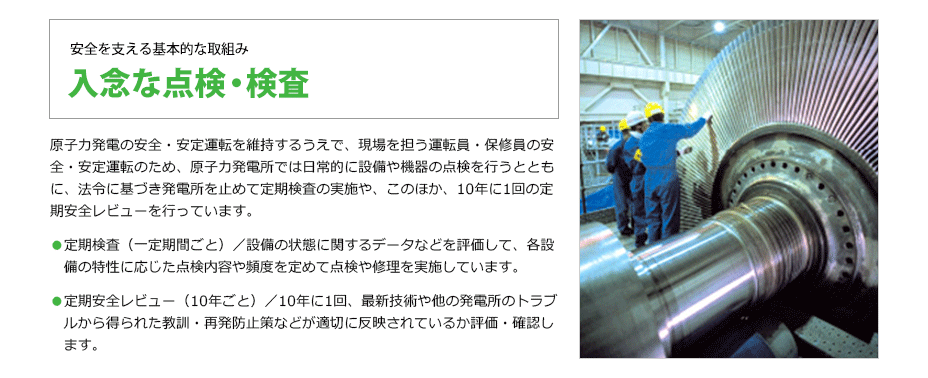 東日本大震災以降、福島第一原子力発電所事故を踏まえた反省に基づき、全社を挙げて規制の枠組みにとどまらない安全性向上の取組みを推進しています。