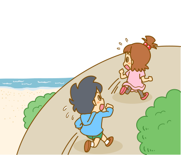 山の近くでは、すぐにガケからはなれるようにしよう。海の近くでは、なるべく高い場所や建物に避難をしよう。