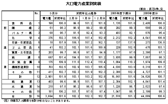 2006年3月分の販売電力量は、121億5千万kWhとなり、対前年比は102.3%と5カ月連続で前年実績を上回りました。