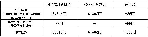 | ※平成24年8月分電気料金より再生可能エネルギー発電促進賦課金(66円)が含まれます。 | |