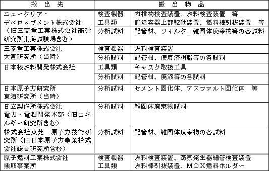 各発電所のL型輸送物の搬出状況を確認したところ、当社と関係する搬出先は以下の7社であった。