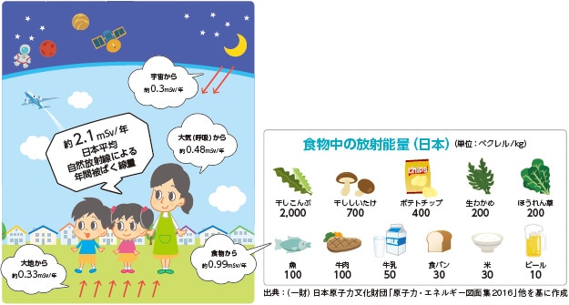 また、野菜や魚などの食物にももともと放射性物質が含まれており、それらを食べることで私たちの体内にも取り込まれています。