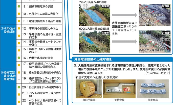 - 平成24年3月28日に原子力安全・保安院が東京電力福島第一原子力発電所事故の技術的知見に関する国の審議会での議論を踏まえて取りまとめた30の安全対策について、当社が大飯発電所3、4号機において緊急安全対策・自主的取組み(短期対策)として実施してきたことに加え、現在実施中である信頼性向上対策(中長期対策)のうち、新たに4項目の対策(鉄塔基礎の安定性評価と必要な対策の実施、送電線路が送電不能になった場合の復旧マニュアルの整備と復旧に必要な資機材の確保、建屋内の重要なエリアの扉を信頼性の高い水密扉に取替え、浸水時に備えた可搬式排水ポンプの配備)が完了しました。