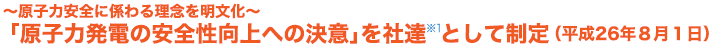 その中で、東京電力福島第一原子力発電所事故から、原子力発電固有のリスクに対する認識や向き合う姿勢が十分ではなかったのではないかということを教訓として学んだことを踏まえ、安全性向上に向けた自主的かつ継続的な取組みのさらなる充実を進めていくこととしました。