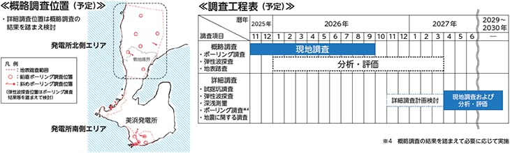 - 概略調査(自:2025年11月 至:2027年3月) :ボーリング調査、弾性波探査、地表踏査