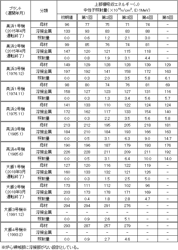 当社各プラントの上部棚吸収エネルギーを表2に示します。これらのデータは,電気技術規程「原子力発電所用機器に対する破壊靭性の確認試験方法」(JEAC4206)で示されている判断基準68Jを上回っています。 |