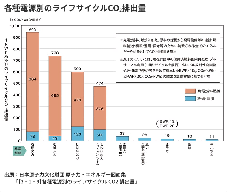また、燃焼を伴わないため、CO2排出量が、石油・石炭と比べると格段に少なく、自然エネルギーを利用した太陽光発電や風力発電と同じ程度しかありません。