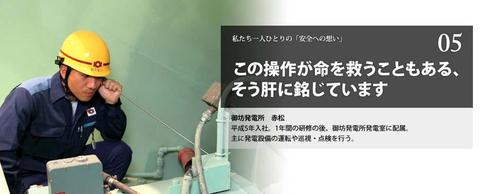 以前、赤松が点検作業中にタービンの不具合が発生したことがあり、不具合解消までの間、重さ約450トンもある巨大なタービンを、当直員総出で1時間以上も回し続け、設備の損傷を防ぎました。※