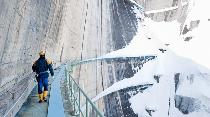 冬の黒部ダム、気温マイナス20度、風速10m/秒を超え、人を寄せ付けない厳しい環境のなか静かに佇みます。冬場は観光ルートが閉ざされ、一般の観光客は足を踏み入れることがきなくなりますが、ここを職場として働き続けるダム水路員は、冬の間も6日間勤務3日休日の4人体制で監視にあたっています。
