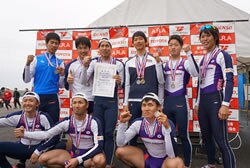 シングルスカルに出場した3選手は、今シーズン初レースだったためか予選では思うような漕ぎができませんでしたが、徐々に感覚を取り戻し、3選手ともに準決勝へ進出しました。準決勝では3選手が同レースであたることになりました。どの選手も前半から積極的なレース展開を見せましたが、濱上選手が後半の伸びで他クルーを抑え、決勝へ進出しました。決勝では強豪選手が揃う中、濱上選手は勢い良くスタートを切りました。500m地点ではまだまだ分からない位置につけていましたが、ラストスパートで2位争いに離され4位でのゴールとなりました。