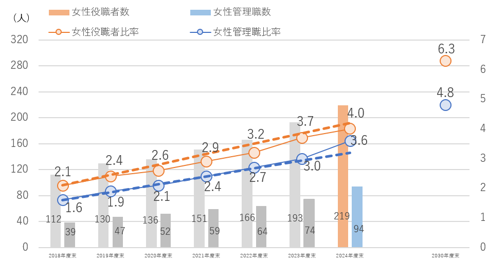 2030年度 女性役職者比率を2018年度の3倍(6.3%)以上