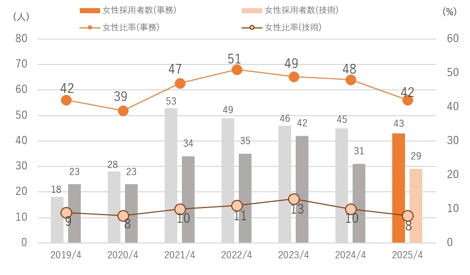 女性採用者数・比率(事務系)※1※3※4 毎年 40%以上 46人